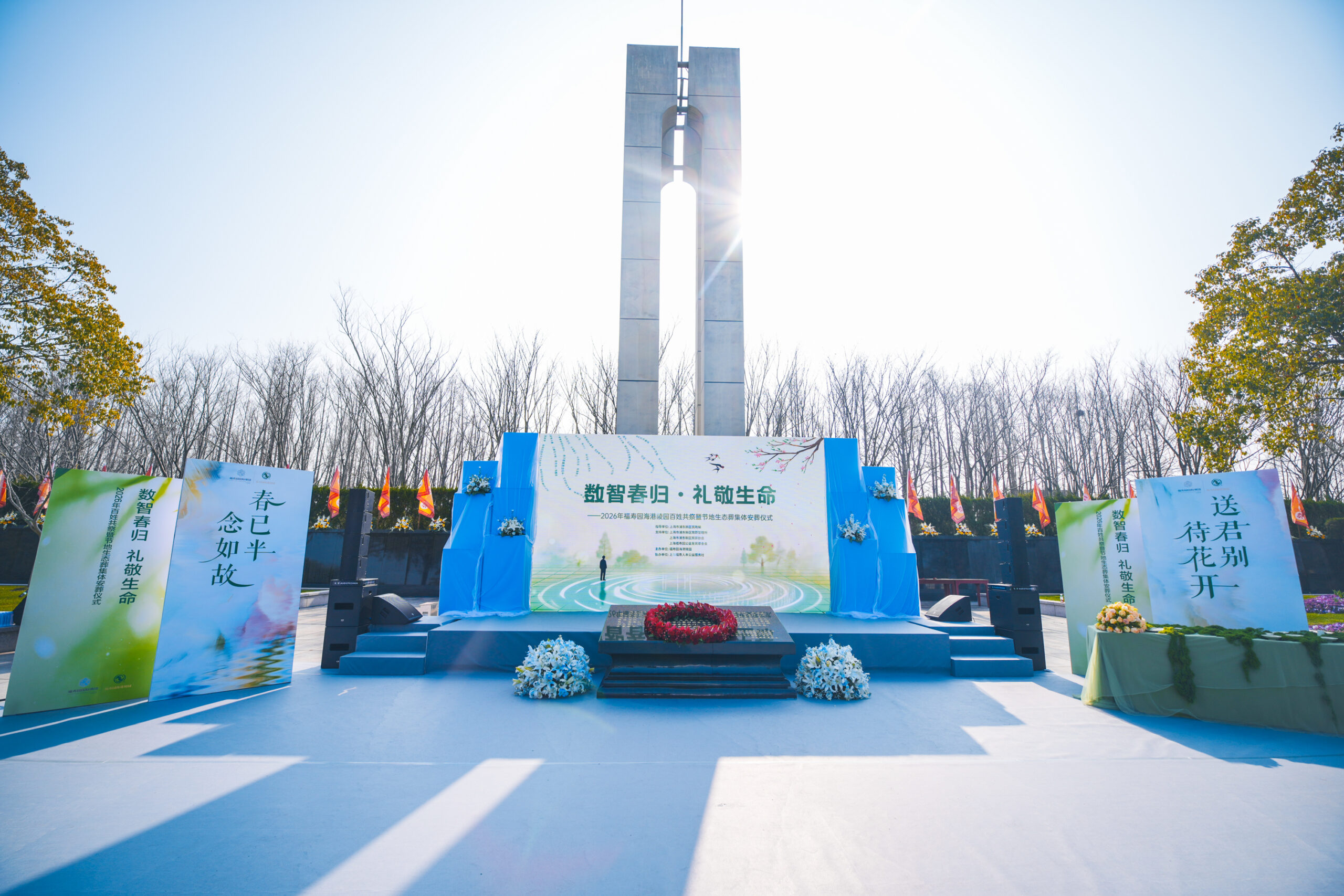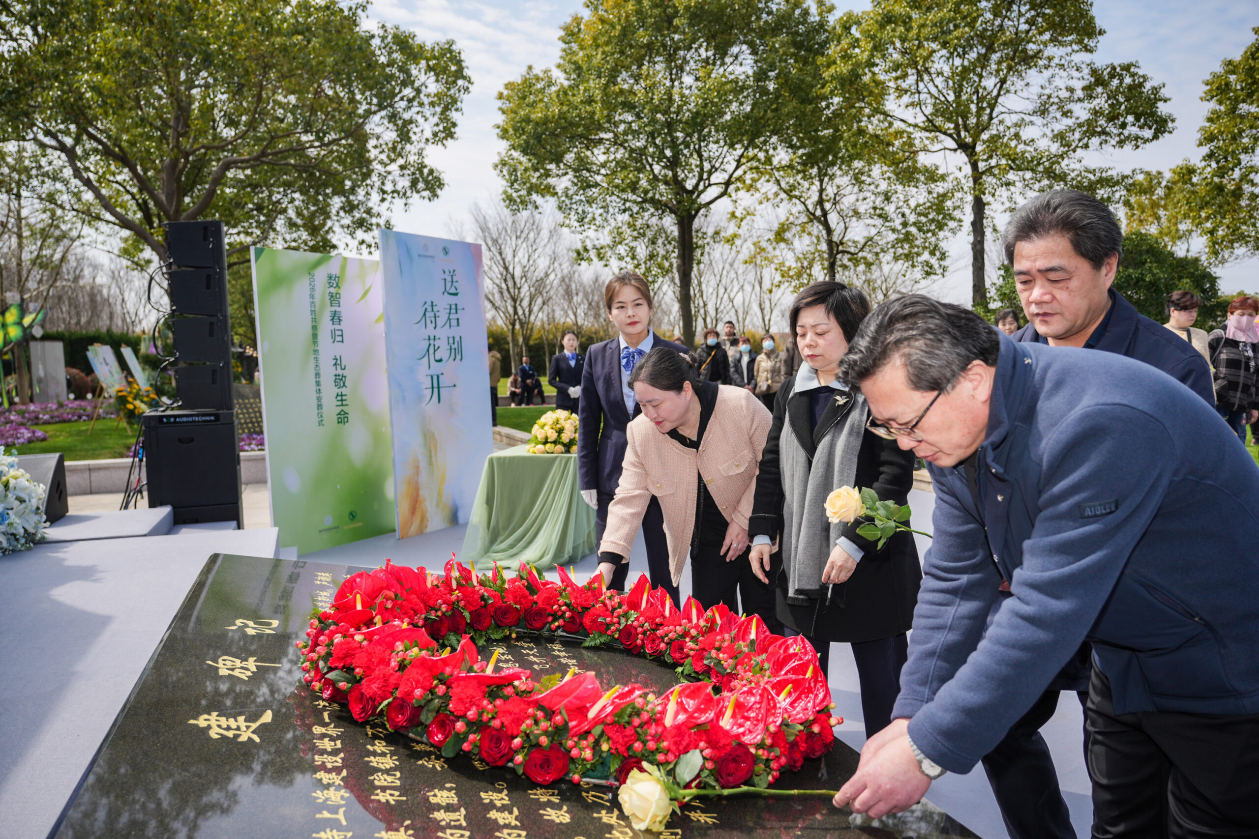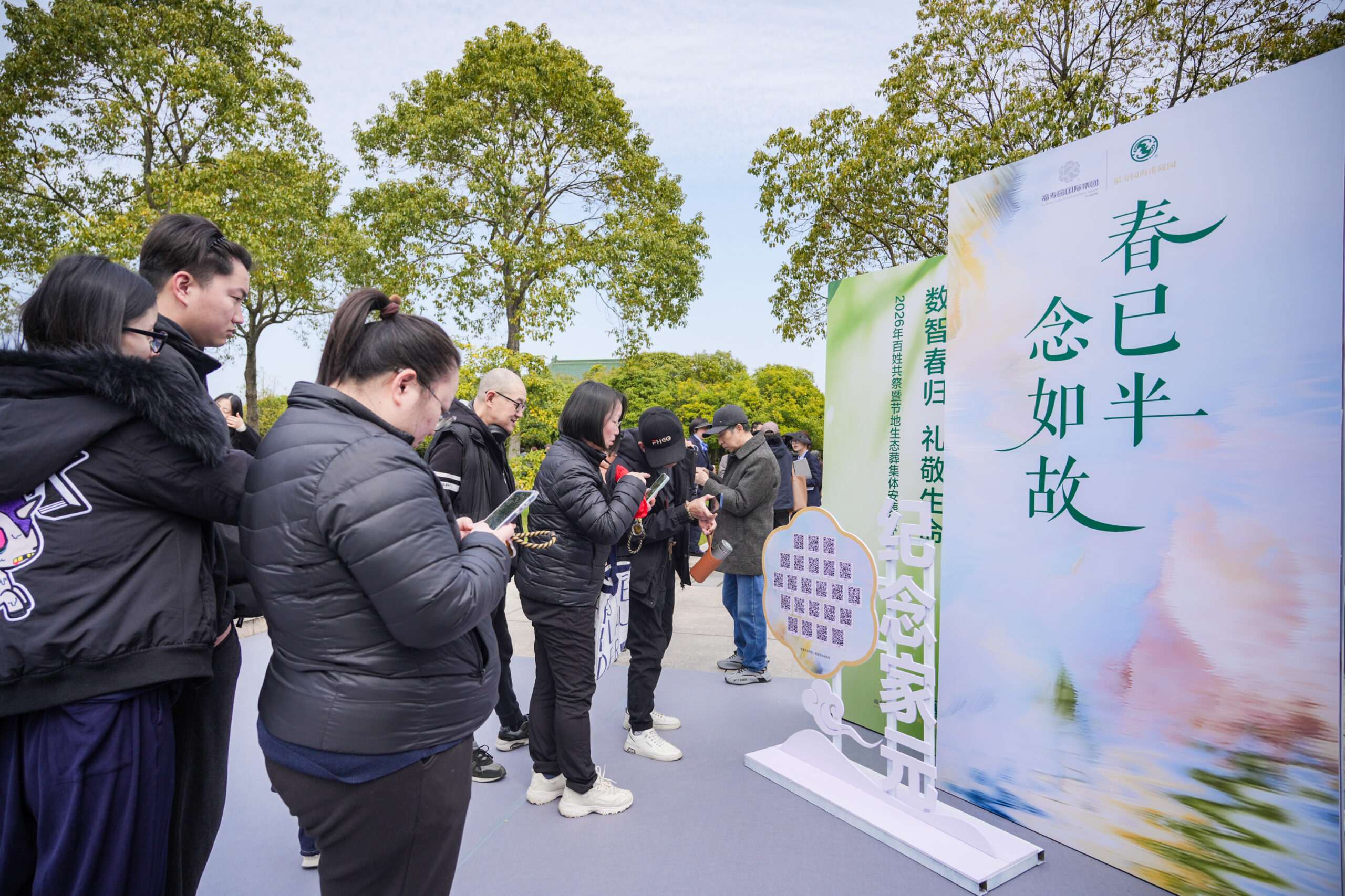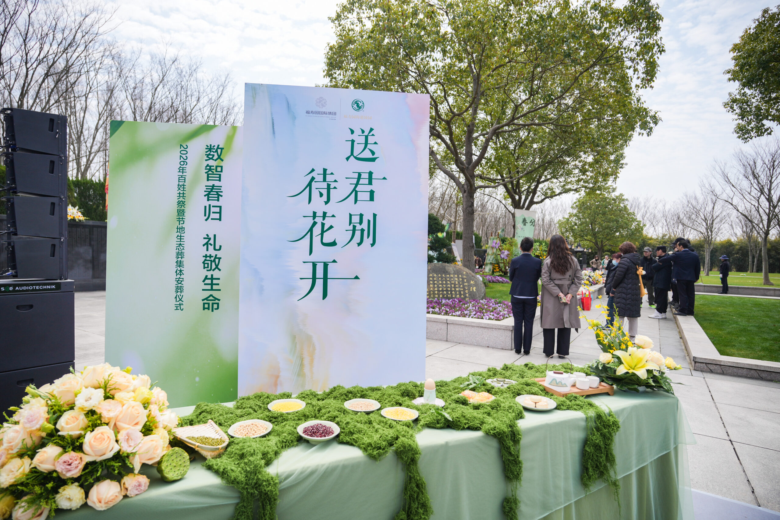 春风拂暖,草木有情。3月20日,2026年百姓共祭暨公益生态葬集体安葬仪式在福寿园海港陵园百姓纪念广场举行。泥城镇动迁办领导严石明、潘金标、书院镇动迁办领导陈菊英、福寿园国际集团品牌中心总经理王艳华、上海市浦东新区殡葬协会会长、福寿园海港陵园总经理刘保林、上海福寿园礼仪服务有限公司总经理顾丽燕、福寿园海港陵园副总经理熊懋、叶宇英、总经理助理孙毅和来自社会各界的媒体朋友出席活动,选择集体生态葬式的54家安葬市民亲属和往年生态葬家属代表共约200人参加活动。本次活动以“数智春归,礼敬生命”为主题,纪念临港新片区公益动迁先民,以AI数字技术赋能,为选择公益生态安葬的先行者们举行数字化追思缅怀及集体安葬仪式,实现“生命归自然,思念寄云端”。